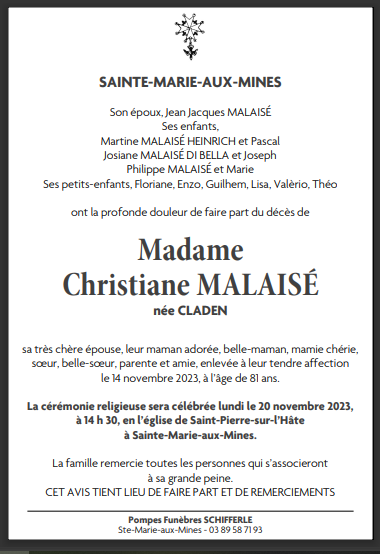Epouse de Monsieur Jean Jacques MALAISÉ