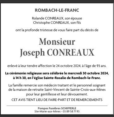 Décédé à Sainte-Croix-aux-Mines (68160, France) le jeudi 24 octobre 2024 à l'âge de 93 ans