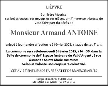 Décédé à Sainte-Marie-aux-Mines (68160, France) le lundi 3 février 2025 à l'âge de 90 ans