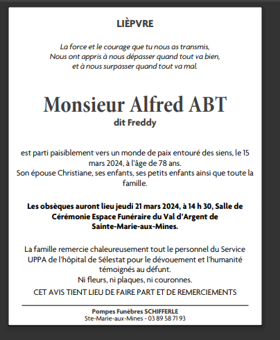 Décédé à Selestat (67600, France) le vendredi 15 mars 2024 à l'âge de 78 ans