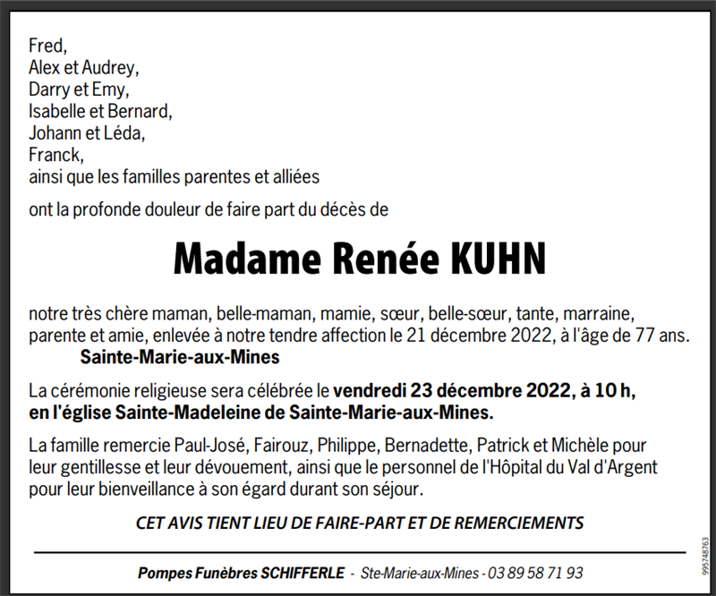 Décédée à Sainte-Marie-aux-Mines (68160, France) le mercredi 21 décembre 2022 à l'âge de 77 ans