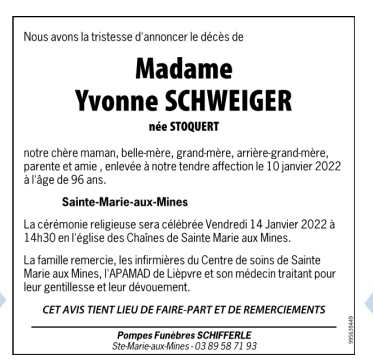 Madame YVONNE M arguerite SCHWEIGER née STOQUERT