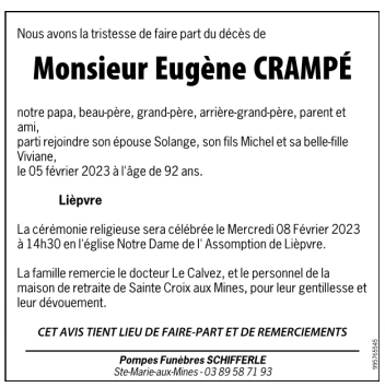 Décédé à Sainte-Croix-aux-Mines (68160, France) le dimanche 5 février 2023 à l'âge de 92 ans