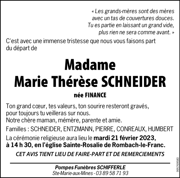 Madame Marie Thérèse SCHNEIDER née FINANCE