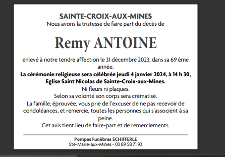 Décédé à Ribeauvillé (68150, France) le dimanche 31 décembre 2023 à l'âge de 68 ans