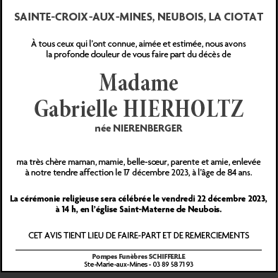 Décédée à Sainte-Marie-aux-Mines (68160, France) le dimanche 17 décembre 2023 à l'âge de 84 ans