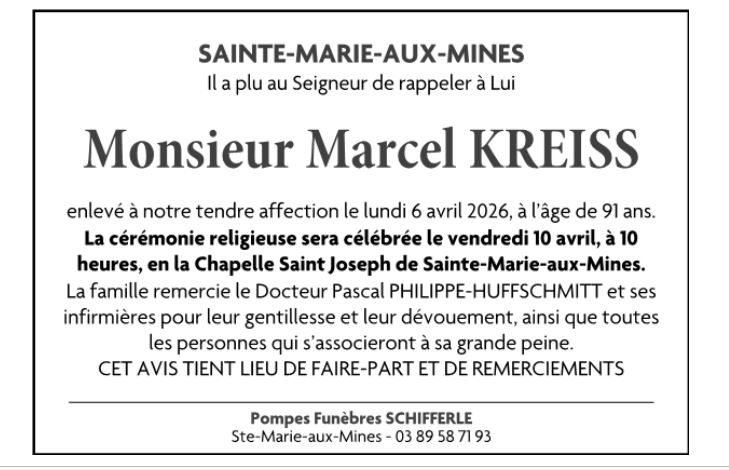 Décédé à Selestat (67600, France) le lundi 6 avril 2026 à l'âge de 91 ans