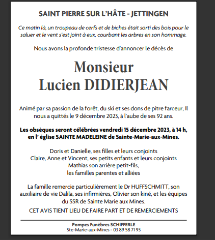 Décédé à Sainte-Marie-aux-Mines (68160, France) le samedi 9 décembre 2023 à l'âge de 91 ans