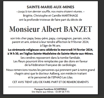 Décédé à Sainte-Marie-aux-Mines (68160, France) le vendredi 9 février 2024 à l'âge de 96 ans