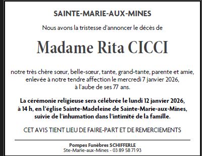 Décédée à Colmar (68000, France) le mercredi 7 janvier 2026 à l'âge de 76 ans