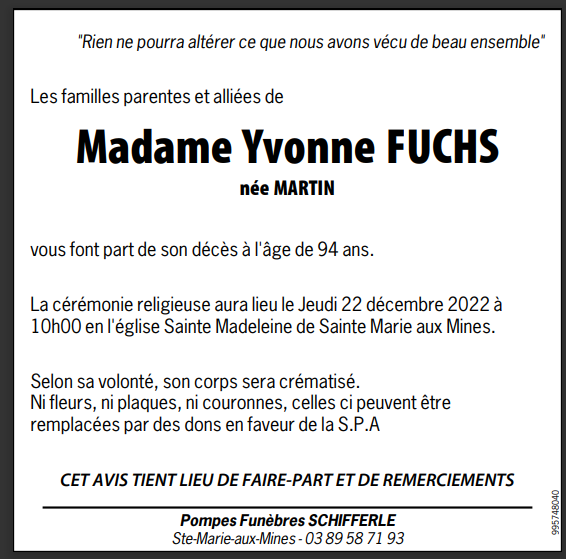 Madame Yvonne FUCHS née MARTIN