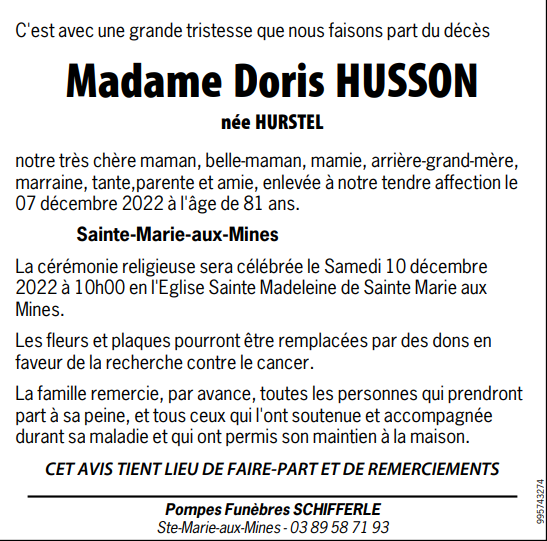 Décédée à Colmar (68000, France) le mercredi 7 décembre 2022 à l'âge de 81 ans