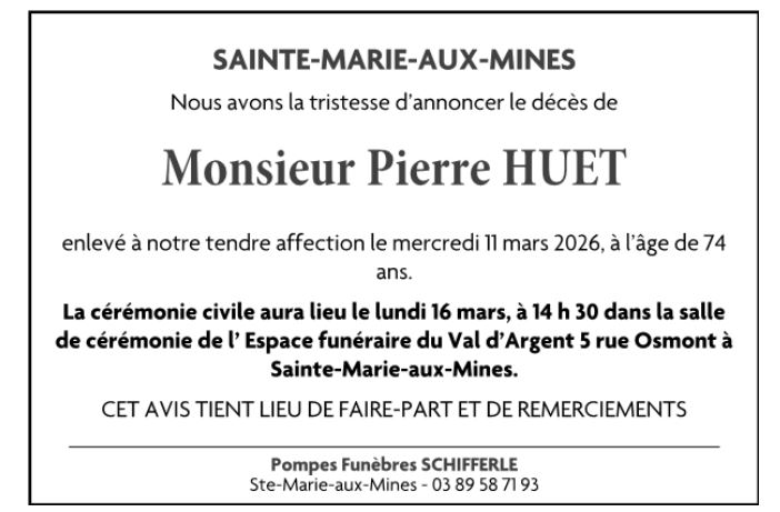 Décédé à Sainte-Marie-aux-Mines (68160, France) le mercredi 11 mars 2026 à l'âge de 74 ans